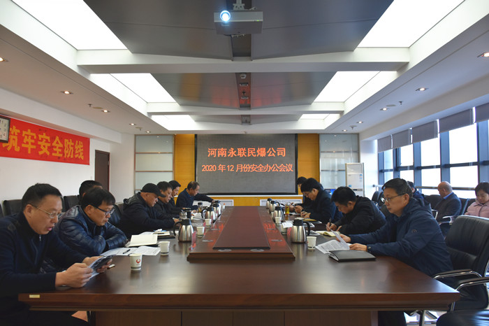 2020年12月31日,河南省永聯民爆器材股份有限公司召開了12月份安全辦公會議,公司領導班子、安委會成員、安委會辦公室成員以及洛寧縣、平頂山力源、南召縣、方城縣、鄧州市、新縣等6家分公司負責人參加了會議。會議由公司副總經理靳義國主持,公司董事長、總經理劉嵩參加會議并講話。