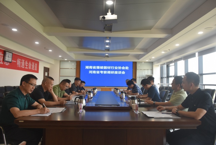 會上,王玉生局長對段星榮調研員一行的到來表示真誠而熱烈的歡迎,并就河南省民爆行業基本情況進行了詳細的介紹;隨后,劉嵩董事長對河南省民爆協會的發展現狀進行了闡述,分享了協會的發展歷程和主要工作;接著,靳義國總經理介紹了公司經營模式、銷售制度以及在發展中的創新與實踐等相關工作;而后,段星榮調研員將湖南省民爆行業現狀、市場發展需求及趨勢等相關情況進行了介紹。會后,雙方就現階段民爆行業的發展狀況及企業的改革、經營、安全等方面問題進行了深入交流和探討。