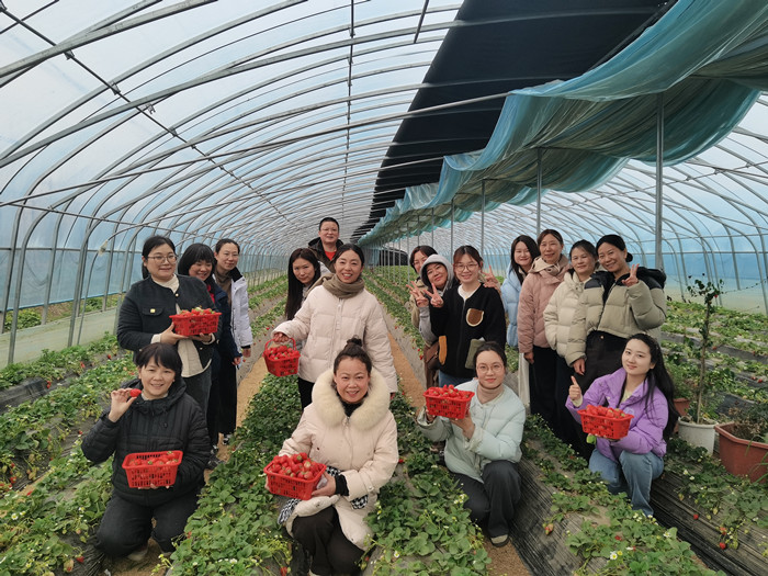 走出博物館,來到生機勃勃的草莓采摘園,開啟踏青采摘之旅。暖棚內綠意盎然、果香四溢,鮮紅飽滿的草莓綴滿藤蔓。女職工們手提果籃,穿梭于壟間,精心挑選、細心采摘,一邊品嘗鮮甜草莓,一邊暢談歡笑,歡聲笑語回蕩在田間地頭。在清新的田園氣息中,大家舒緩了壓力、放松了身心,增進了情誼,現場洋溢著溫馨和諧、輕松愉悅的濃厚氛圍,盡情享受春日田園的愜意與美好。